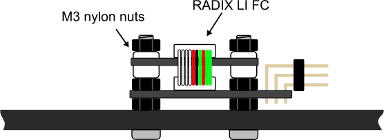 The RADIX LI FC and the RADIX LI wPB are designed to be stacked together. Use the wire included with the RADIX wPB to connect them together and use M3 screws and nylon nuts to mount the the FC on top of the wPB. Make sure that you use one nylon nut on top of the wPB and one underneath it to ensure adequate spacing and airflow. Do not mount the RADIX wPB to your airplane using double sided tape only, as the shunt resistor for current measurement on the bottom of the wPB needs airflow for cooling.