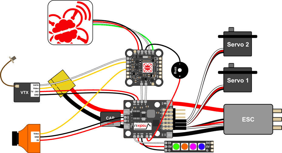 The RADIX LI flight controller can control programmable RGB LED’s, which are bright LED’s that can be used to differentiate pilots by color in a race, blink in different colors, etc. In short, they make your wing look cool and help other pilots to better see you, especially at night. It also has support for a buzzer that can be activated using a switch on your RC transmitter. Buzzers are very useful for locating your plane when you unintentionally land in a corn field or forest ;).