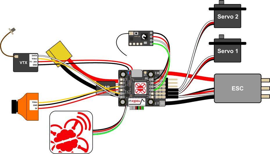 The signal wires of the RC receiver are connected to RX3 and TX3 of the RADIX LI FC. For all other supported receiver types, refer to the RADIX manual; The wiring is the same as for the RADIX FC.