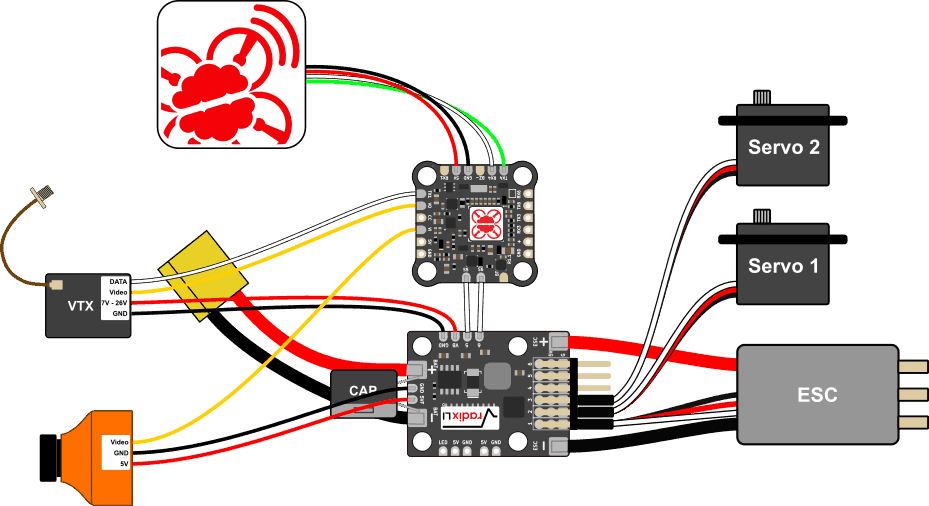 Video transmitters (VTX) consume a lot of power and so do combined HD/FPV cameras, so they need to be powered from the RADIX LI wPB. The wPB has a filtered 5V output (“5VF”) that can supply up to 1 A, as well a a “VB” output that supplies battery voltage. Depending on your VTX and camera, you need to either power them from 5V or from the battery voltage.