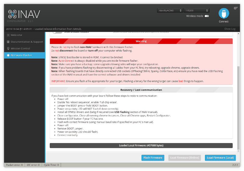 When used for airplanes, the RADIX LI flight controller uses a custom version of iNav with extra graphical OSD features. To install it on your RADIX LI, download the iNav Configurator, as well as the firmware (hex file) from the BrainFPV iNav release page. After that, start the iNav Configureator and under Firmware Flasher, click on “Load Firmware [Local]” and open the downloaded hex file. Then click on “Flash Firmware”. If you have problems flashing it, please see here.