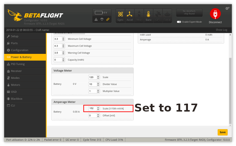 The current sensor scaling for the ESC is 11.75 mV/A (so the ESC will output 11.75 mV for each Ampere of current that it draws). This means the current meter scale in Betaflight needs to be set to 117: