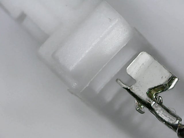 When inserting the wires into the connector housing, make sure that the hook of the crimp contact faces the bottom of the connector. The bottom is the side with the little tabs that hold the contacts in place. If you accidentally insert a contact at a wrong location, use an knife of tweezers to carefully lift the tab and pull out the contact. Make sure to not bend the tab too much, as it won’t securely hold the contact if you do so.