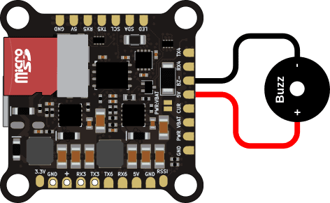 If you use a buzzer, wire it as follows shown below. The buzzer + pad needs to be connected to a 5 V pad on the flight controller. The buzzer – pad to the BZ- pad. When the buzzer is activated, the flight controller ties the BZ- to ground using a FET, which activates the buzzer.