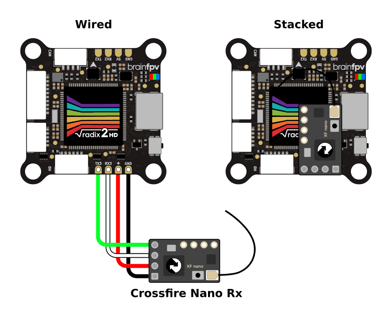 You can either wire the Nano Rx to the RADIX 2 HD, or use the pins included with the Nano Rx to stack it on top and secure it using double sided tape. The Crossfire Diversity Nano Rx is connected the same way.