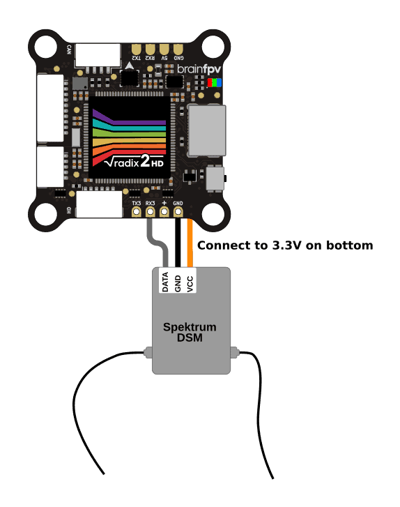 If you use a Spektrum DSM or DSMX satellite receiver, connect it as shown below. Unlike pretty much every other receiver on the planet, the satellite receivers need to be powered using 3.3 V instead of 5 V, so make sure to connect the orange wire to the 3.3 V pad on the bottom of the RADIX 2 HD.