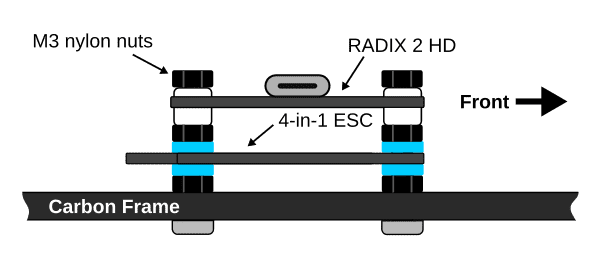 Also make sure you have adequate spacing between the carbon frame and the 4-in-1 ESC, and the 4-in-1 ESC and the RADIX 2 HD. If you have sufficient vertical space, we recommend adding additional nylon nuts between the components, as shown below. Without the additional nylon nuts, it is more likely that components get damaged during a crash when the silicone grommets get compressed and the 4-in-1 ESC touches the carbon frame or the RADIX 2 HD.