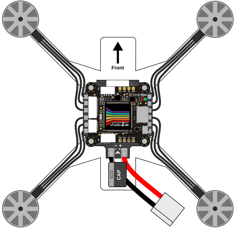 When installing the RADIX 2 HD in your drone, make sure the orientation is correct. I.e., the connectors should face upwards and the small white arrow in the front / center of the flight controller should point in the forward flight direction, as shown below. Note that it is possible to install the flight controller in a different orientation, but you will need to configure the orientation of the flight controller in Betaflight / INAV if you do so.