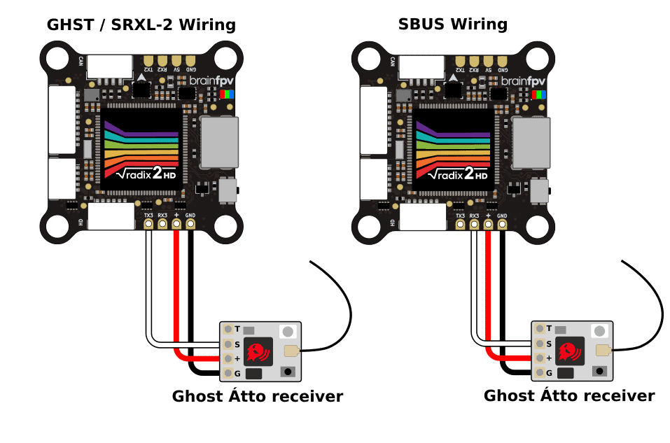 The Immersion RC Ghost system is a medium to long-range RC system operating on the 2.4 GHz band. The receivers can use different protocols. The preferred protocol is GHST which is supported by both Betaflight and INAV. Wire the receiver as shown below. Note that the signal wire connects to the TX3 pad of the RADIX 2 HD, not to the RX3 pad. Alternatively, the Ghost receivers can also use the SRXL-2 or SBUS protocol.