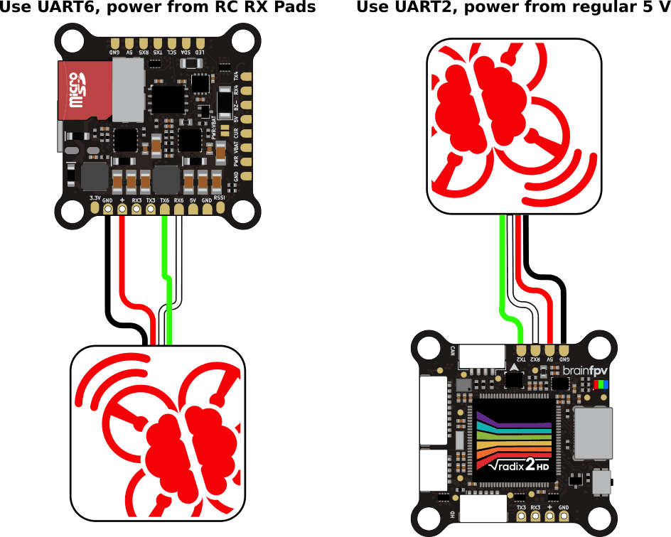 We recommend using the BrainFPV GPS, but any module with a uBlox chipset will work. Most GPS receivers need to be powered from 5 V and need to be connected to a serial port (UART RX / TX pair) of the RADIX 2 HD. The diagram below shows two options for how to connect the GPS: