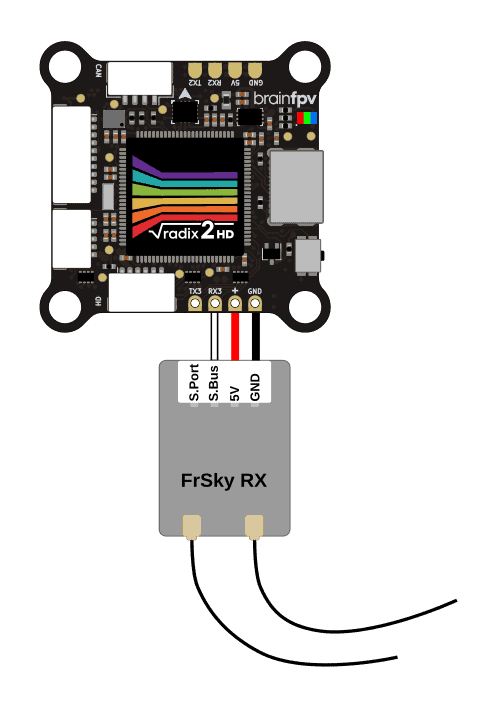 The diagram below shows how to connect a FrSky S.Bus receiver to the RADIX 2 HD. The S.Bus wire carries the RC data and needs to be connected to RX3. Some FrSky receivers also have an S.Port wire / pad for telemetry information that allows it to send battery voltage, current draw, etc. back to your RC receiver. If your receiver features S.Port, connect it to TX6 on the bottom of the RADIX 2 HD. Note that you can also use a different TX pad of an unused UART (not RX3, as UART3 is used for S.Bus).