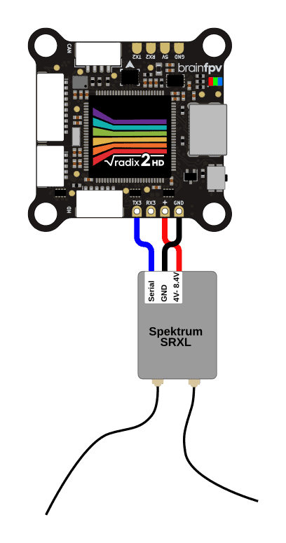 Some newer Spektrum receivers support the SRXL or SRXL-2 protocol and they can be powered from 5 V (amazing!). This RC protocol uses a single wire for both RC data and telemetry. The serial wire needs to be connected to the TX3 pad, as shown below.
