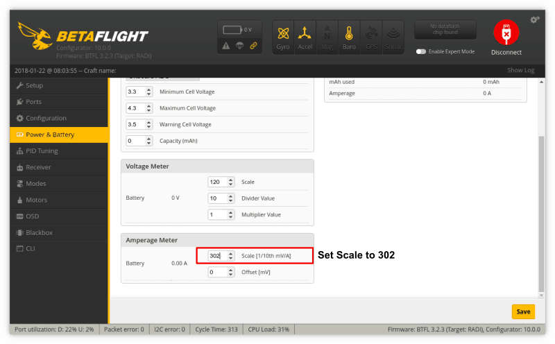 Finally, remember that the 4-in-1 ESC uses a different current sensor than the RADIX PB, so the default scale of “200” will give erroneous current measurements. When using the Hobbywing X-Rotor 40A 4-in-1 ESC, make sure to set the amperage meter scale to 302 in the Betaflight configurator: