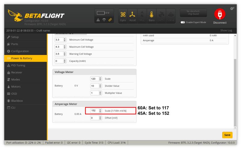 Finally, remember that the 4-in-1 ESC uses a different current sensor than the RADIX PB, so the default scale of “200” will give erroneous current measurements. When using the Hobbywing X-Rotor 60A 4-in-1 ESC, make sure to set the amperage meter scale to 117 in the Betaflight configurator. For the Hobbywing X-Rotor 45A 4-in-1 ESC, set the scale to 152.