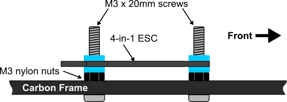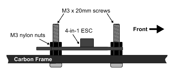Put the screws through the frame and secure them using 4 nylon nuts. Then install the 4-in-1 ESC and secure it using 4 more nylon nuts. Make sure the battery pads (the 2 large solder pads) are facing towards the rear of your drone. The side view should look as follows: