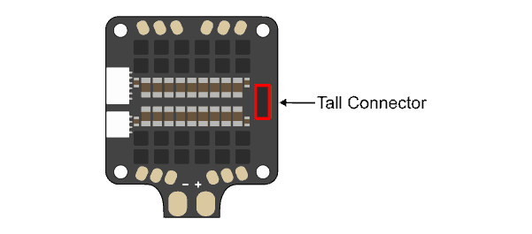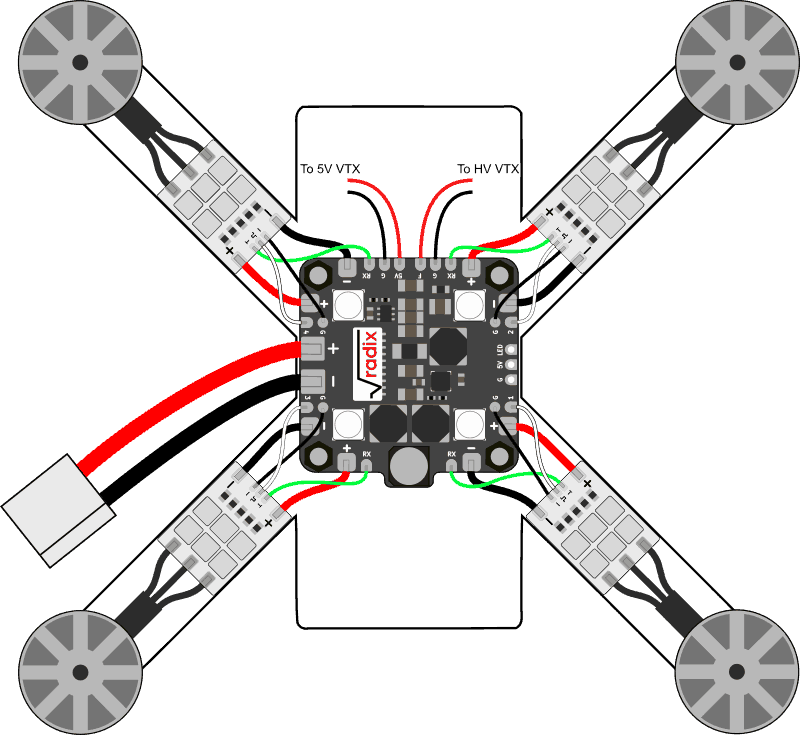 The RADIX FC stacks on top of the 4-in-1 ESC and can be connected to it using the long cable included with the 4-in-1 ESC. Before connecting them, make sure to remove the red 10V wire and the black GND wire on the flight controller side. Leaving them connected will damage the RADIX FC! You can use the 10V/GND wire from the ESC to power a HV video transmitter or a camera. Note: The 60A version of the 4-in-1 ESC no longer has the 10V output. You still need to disconnect the red and black wires on the flight controller side, but you can no longer use them to power your video transmitter. Instead, power the video transmitter directly from the battery pads.