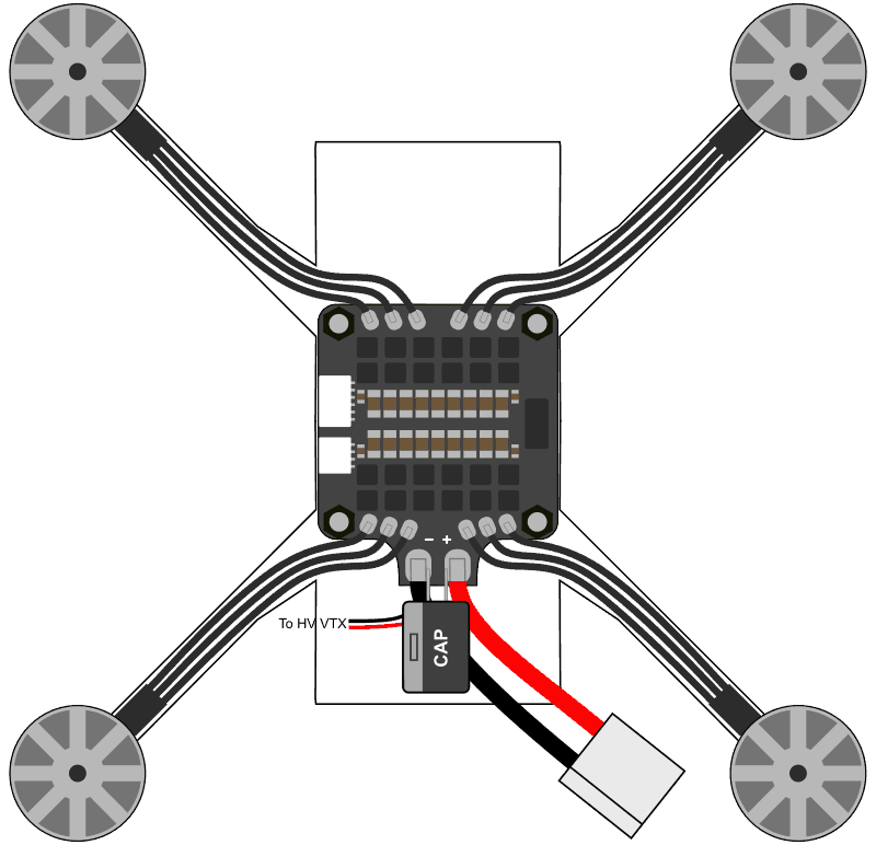 Wire the 4-in-1 ESC as shown below. Each motor is attached to the battery pads in the corresponding corner. Don’t worry about in which order the wires of each motor attached to the 4-in-1 ESC; swapping two wires of a motor will reverse the motor direction, but this can later be changed in software when configuring your ESC’s. Attach the battery cables to the large solder pads on the back of the 4-in-1 ESC. At the same time, solder the 470uF 25V capacitor that is included with the ESC and the wires to the HV video transmitter to the pads. Make sure you install the capacitor the correct way; the gray band on it indicates the negative terminal. When finished, it should look like this: