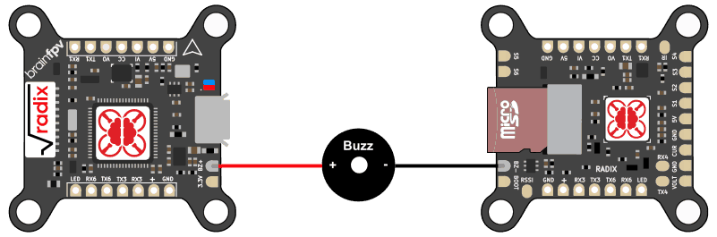 If you use a buzzer, wire it as follows. The buzzer BZ+ pad is on top of the RADIX FC and the BZ- pad is on the bottom: