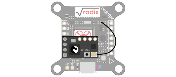 The Crossfire Nano Rx can be wired or directly stacked onto the RADIX FC. If you stack it, use a pin header to connect the two and use some double sided tape to prevent the receiver from bouncing around. Also, keep in mind that it will be difficult to de-solder the receiver from the RADIX FC if you stack them. The Crossfire Diversity Nano Rx can be wired / stacked the same way.