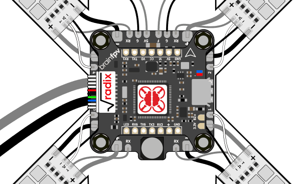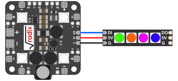 The RADIX FC can control programmable RGB LED’s, which are bright LED’s that can be used to differentiate pilots by color in a race, blink in different colors, etc. In short, they make your drone look cool and help other pilots to better see you, especially at night or indoors. This is why the RADIX PB includes four programmable RGB LED’s, so you get some bling without any additional wiring! However, you can add even more LED’s using the LED output of the RADIX PB.