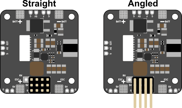 The RADIX wPB can be used with either straight or angled servo headers. Both are included with the wPB. Use whatever works best for the airplane you are building. To install the servo headers, put them in place and solder the pins on the bottom of the wPB.