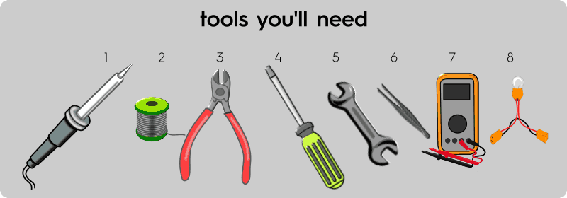 - A soldering iron. Get a decent iron with at least 40W power and exchangeable tips. Check out this video for basic soldering instructions